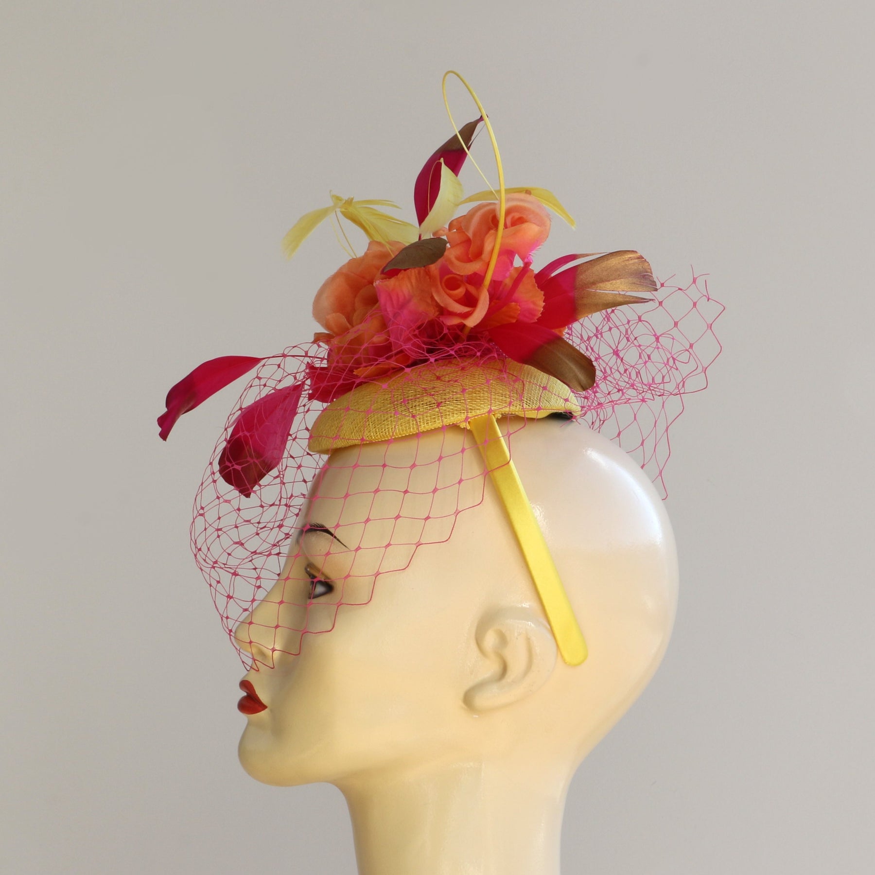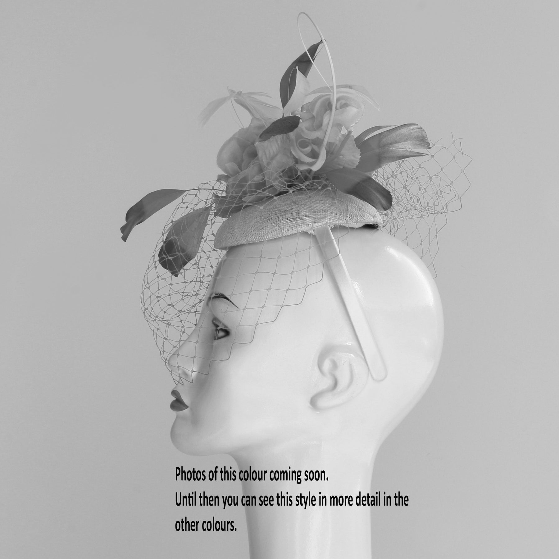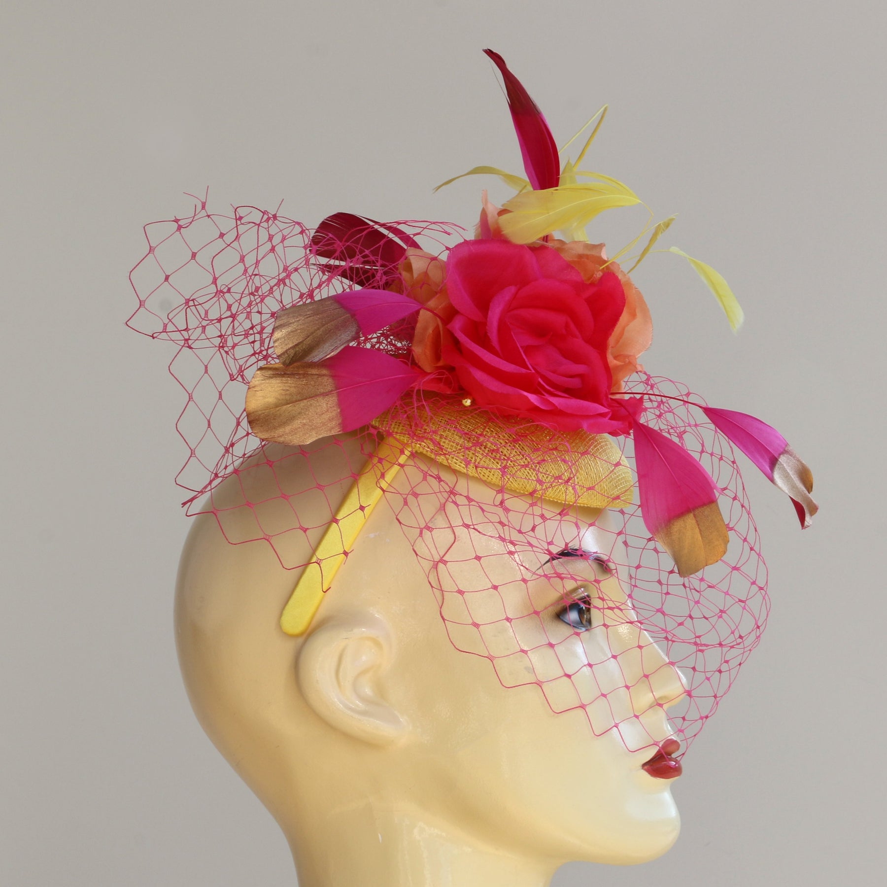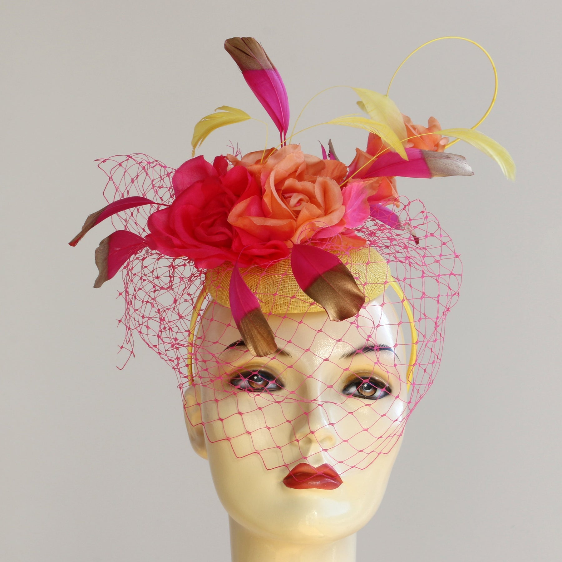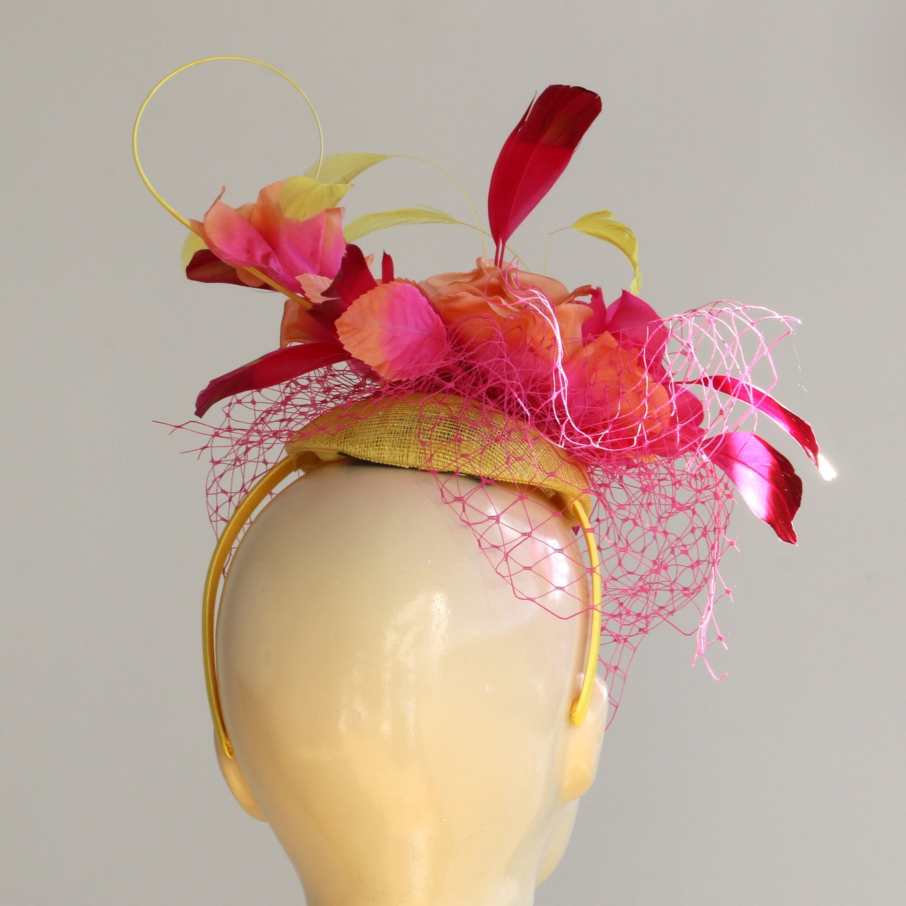 So much packed into this small sinamay pillbox percher hat - multi-coloured silky roses, feathers tipped with gold or silver, veiling and all topped with a sweeping quill.