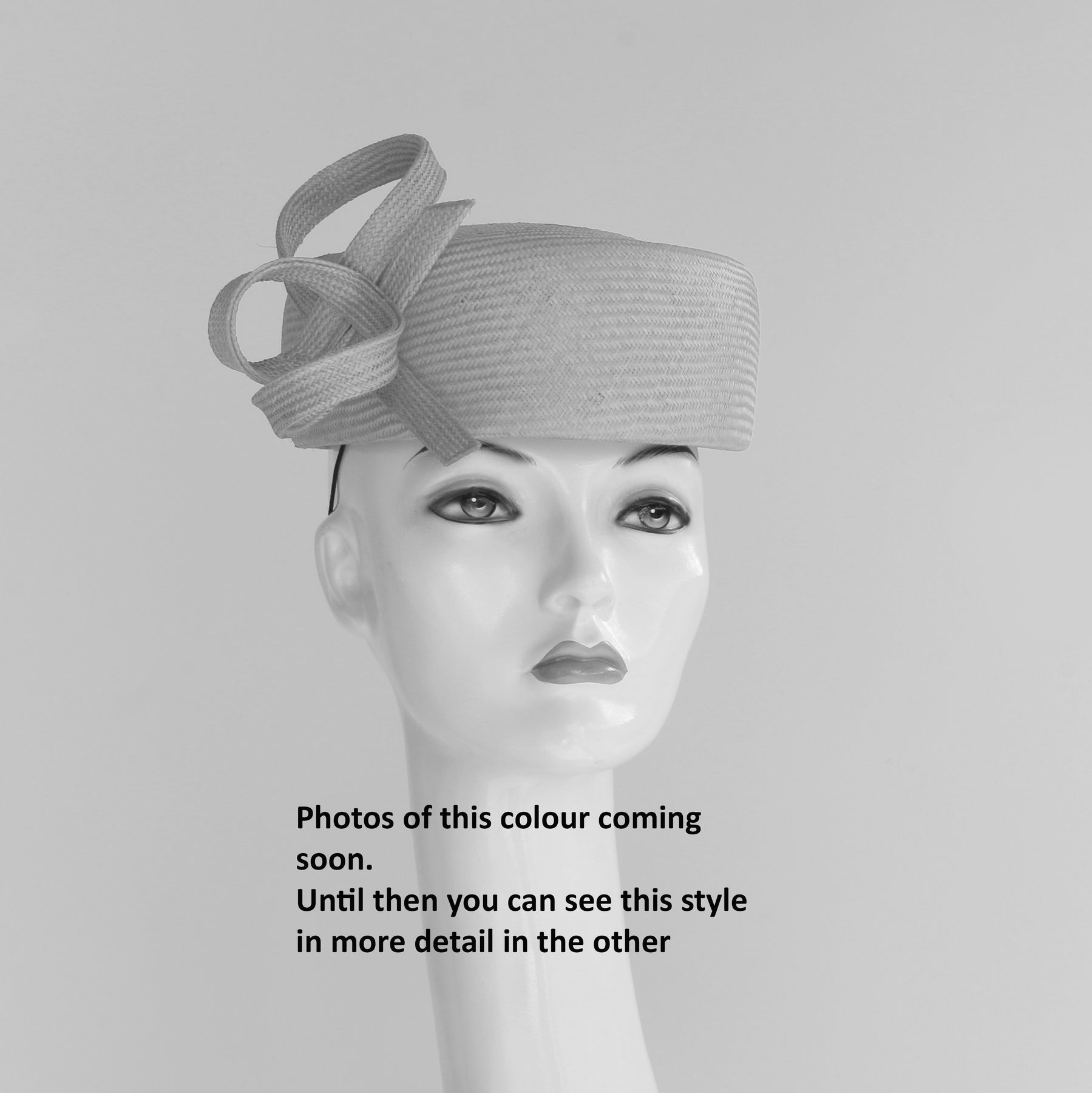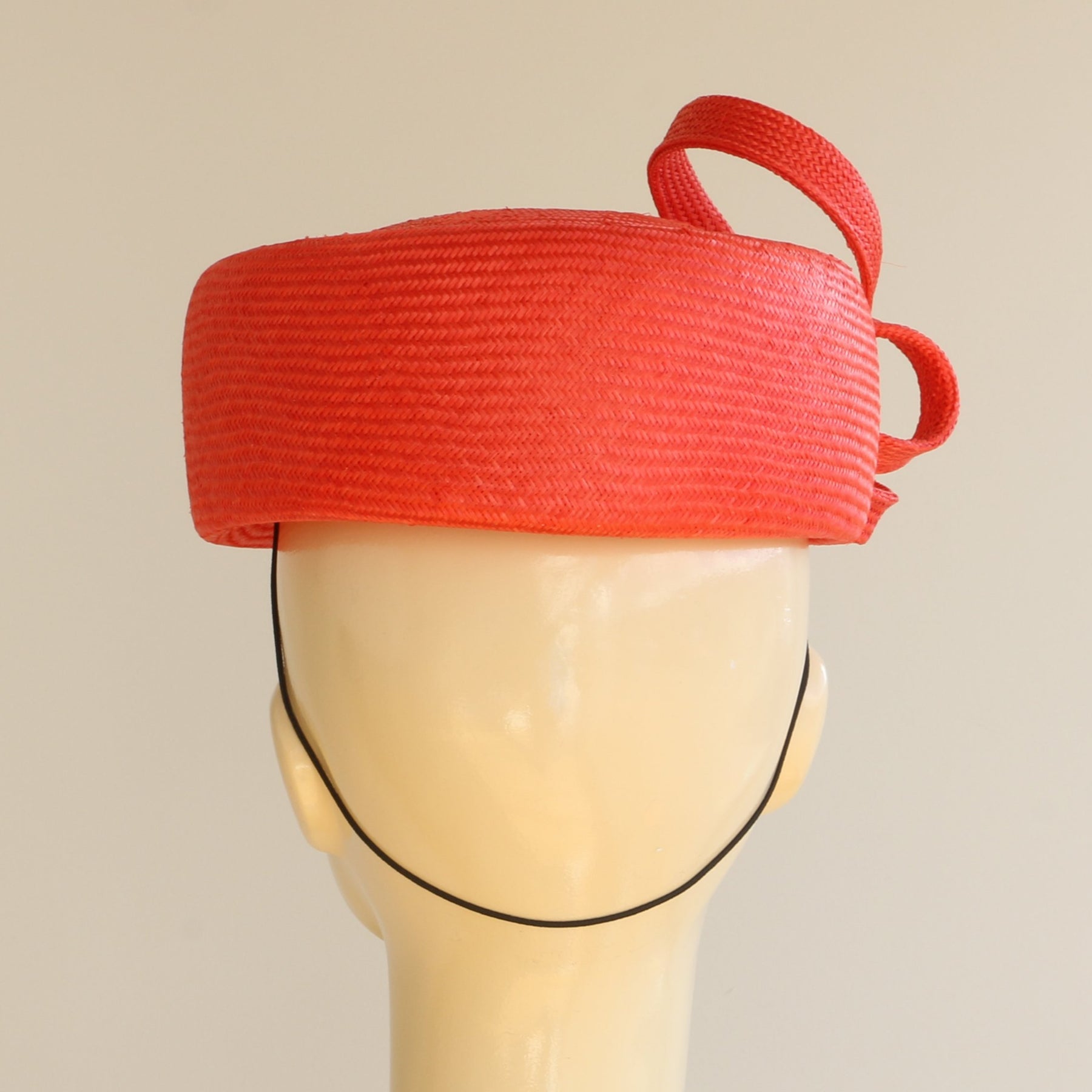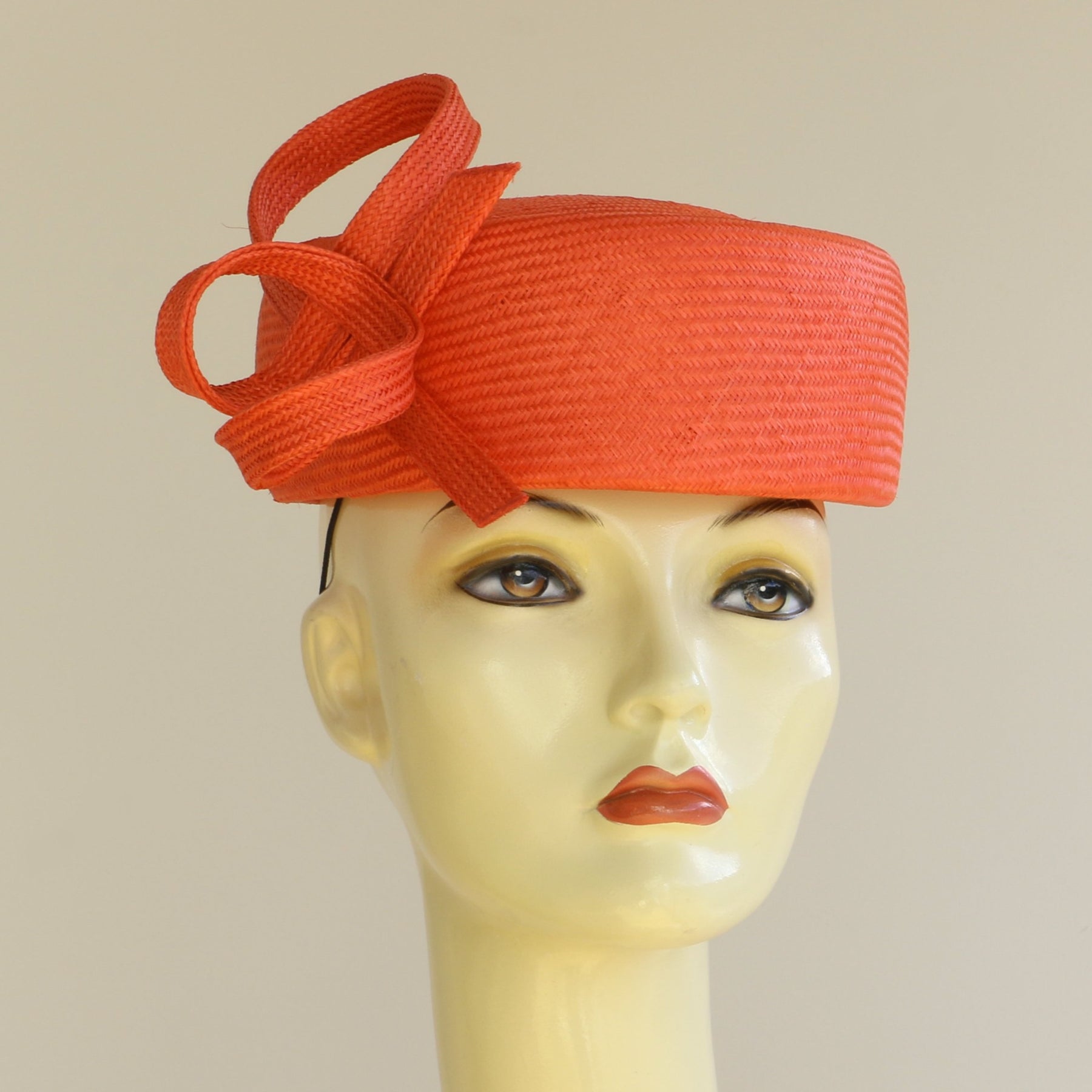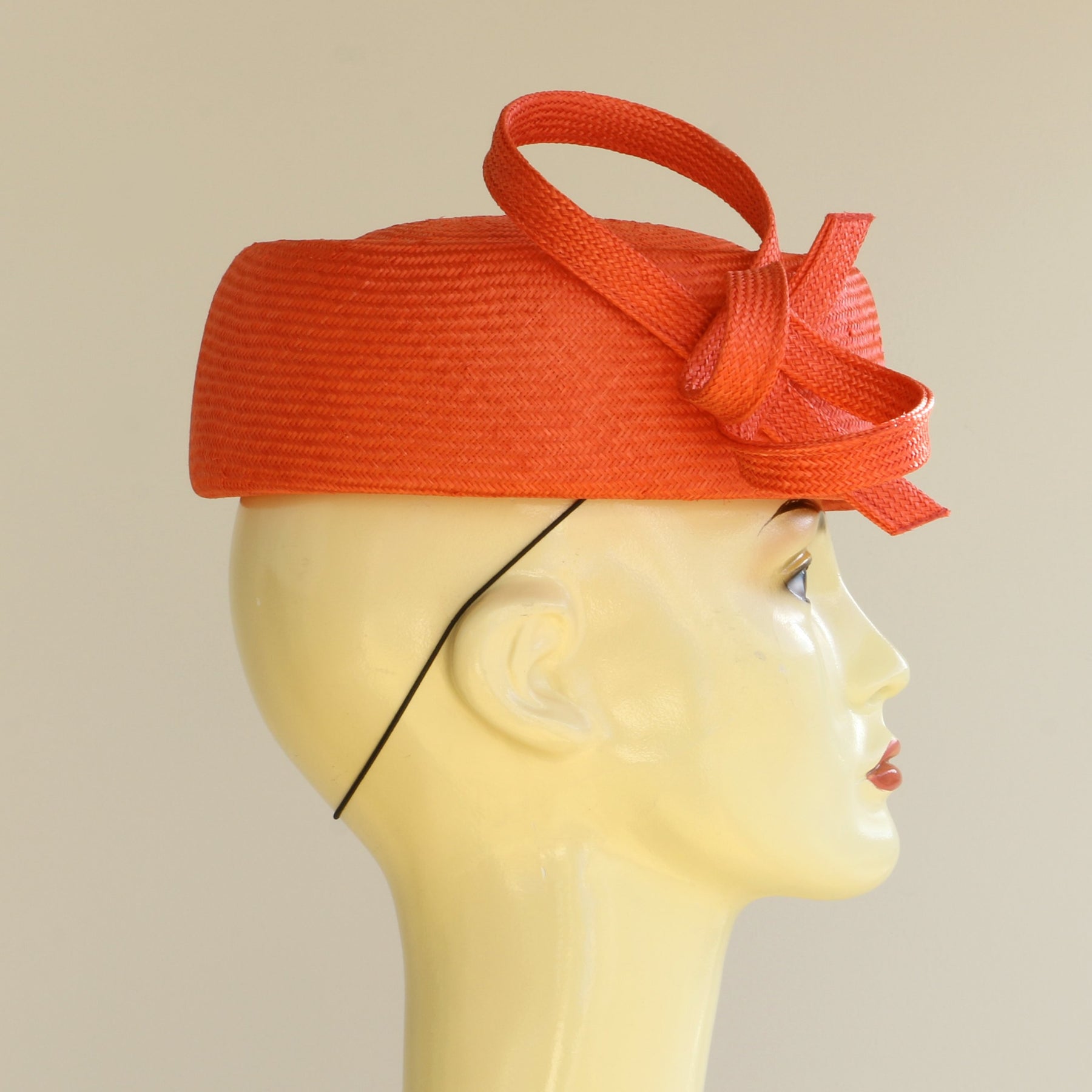 This pillbox hat has a real touch of "Jackie O" retro style but with a modern twist. Made of parasisal in the UK . The deep brim has an edgy twist detail as you see in this rich orange shade, Sunset.