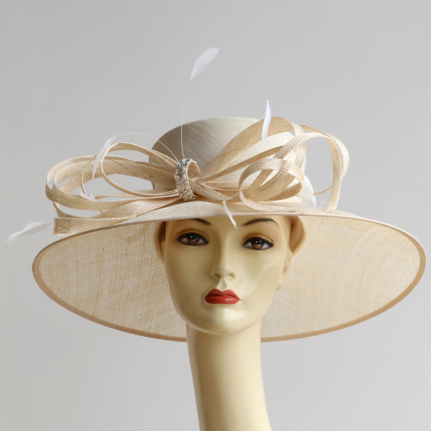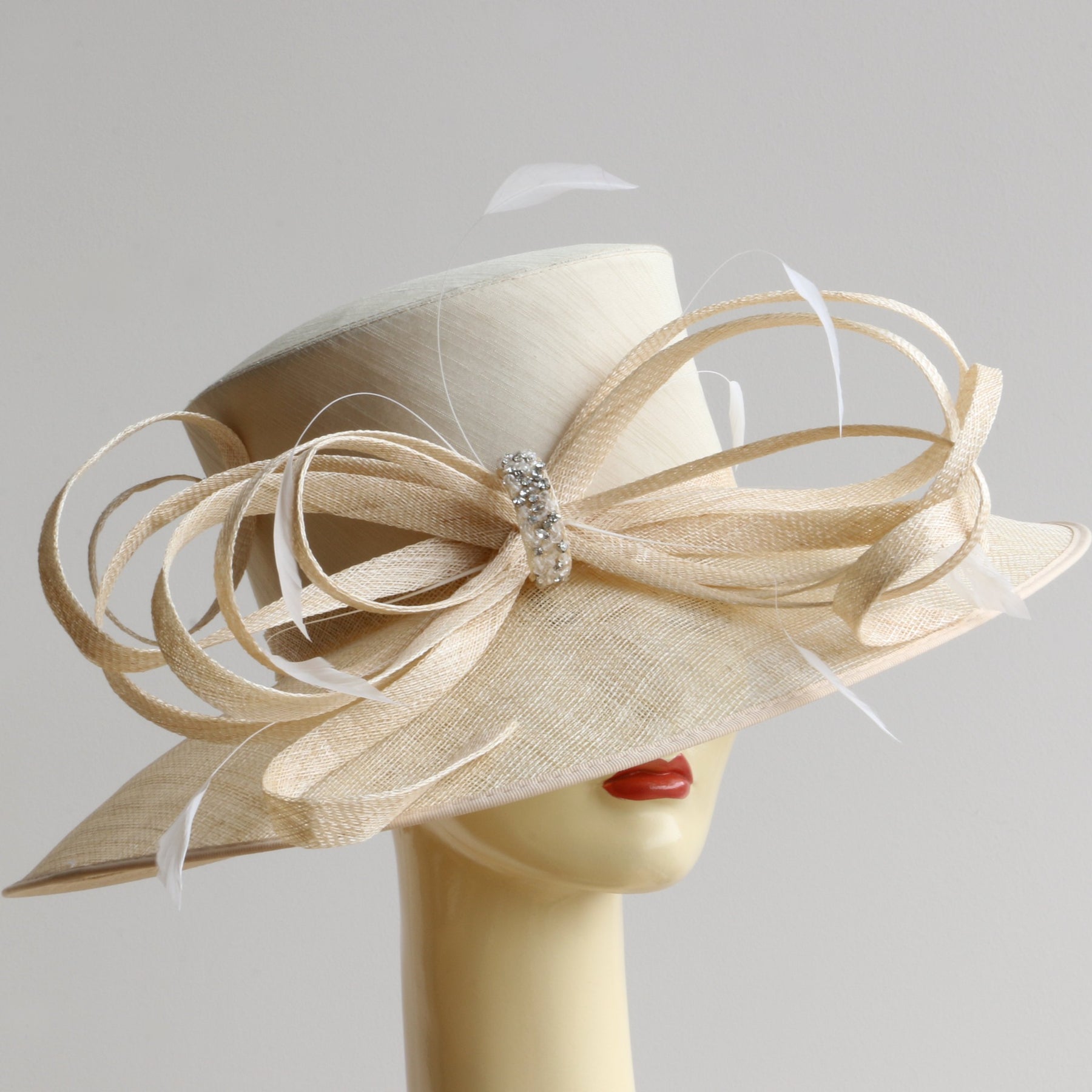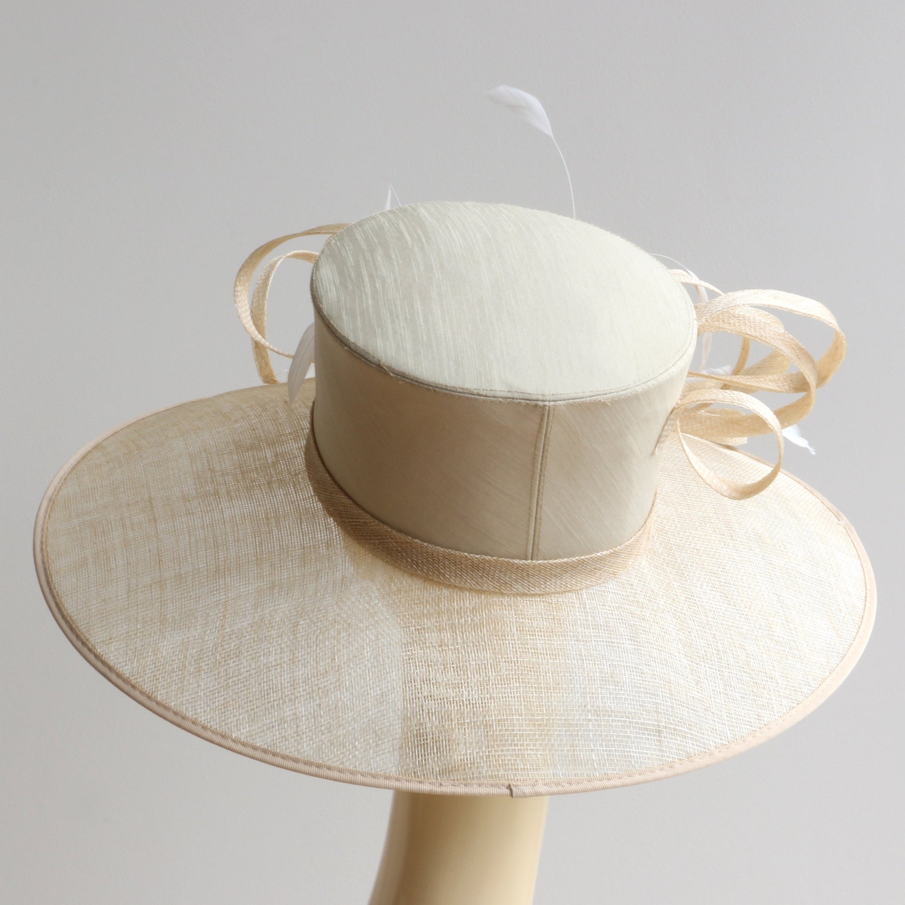 This is a beautiful ladies large brimmed hat in Champagne with a crown of silk, a brim of sinamay with feathers and a large sinamay bow to the front, the centre of which has little sparkles and beads.