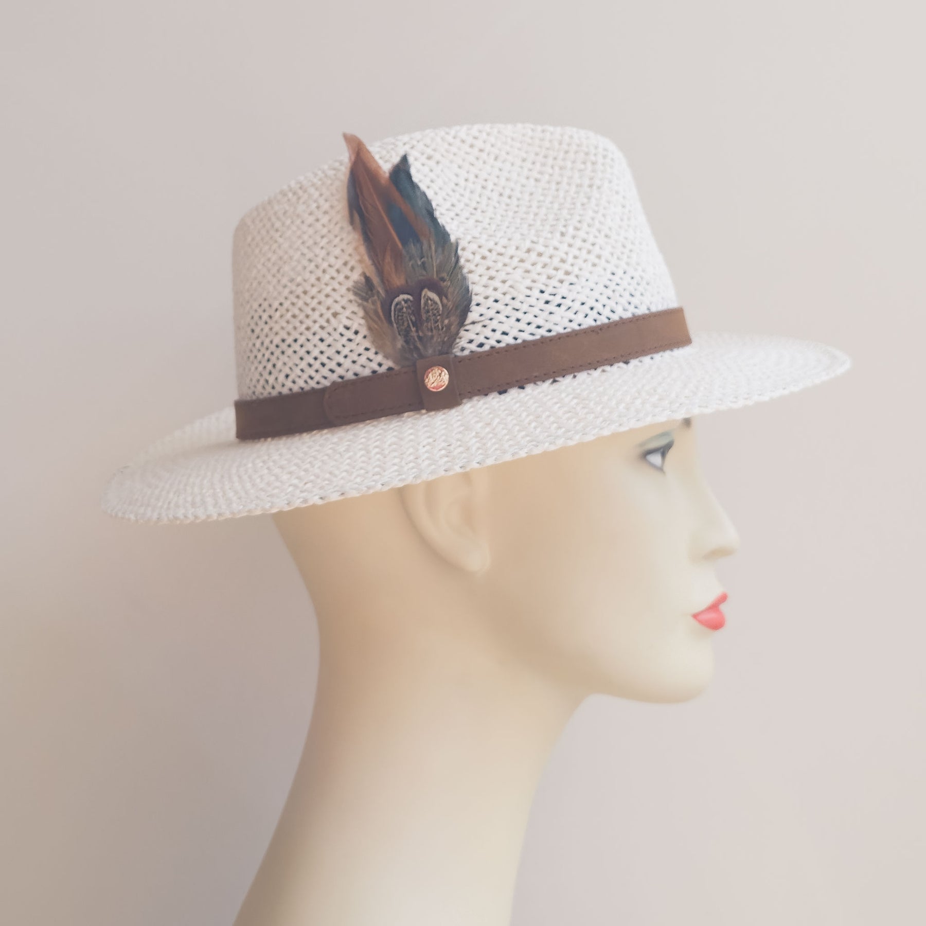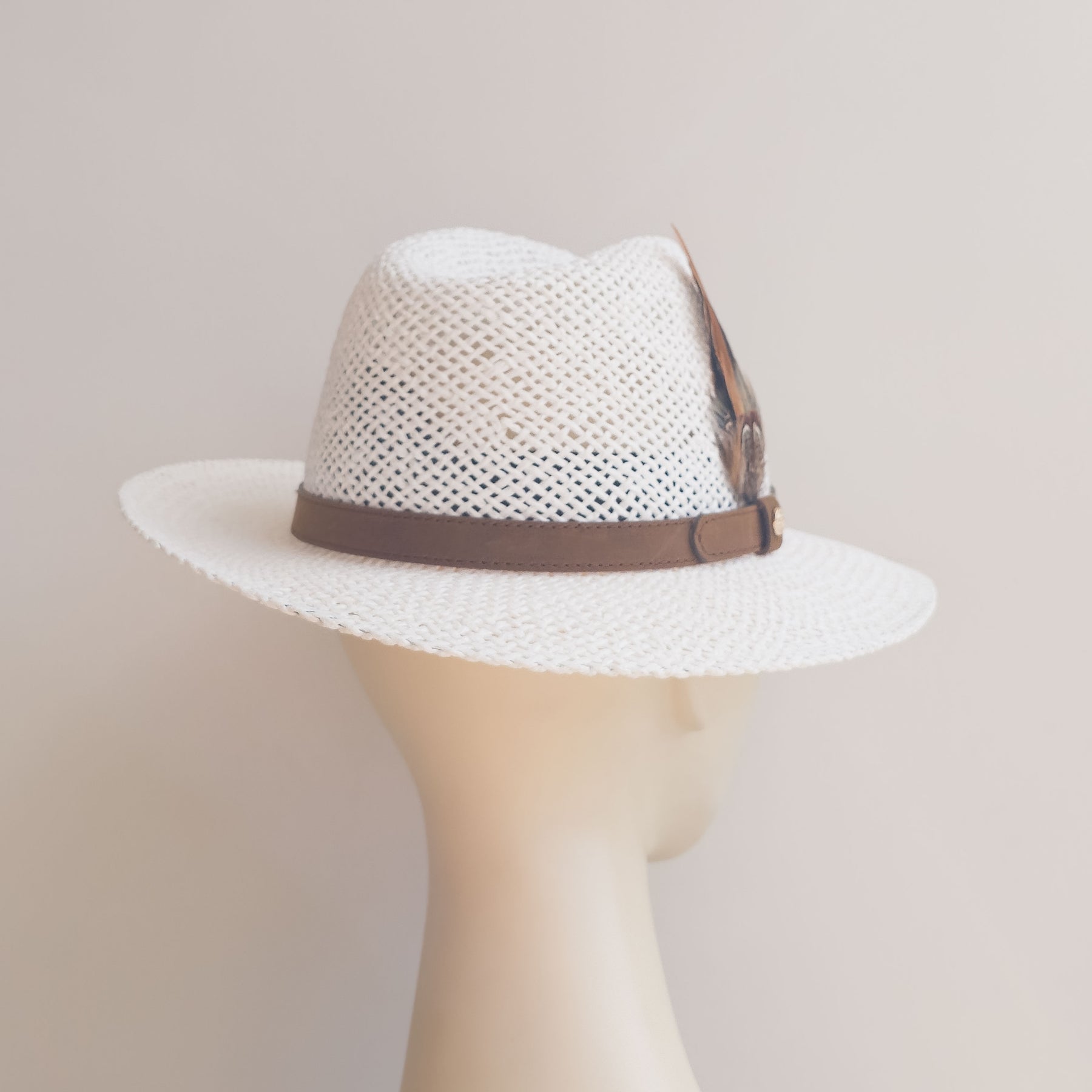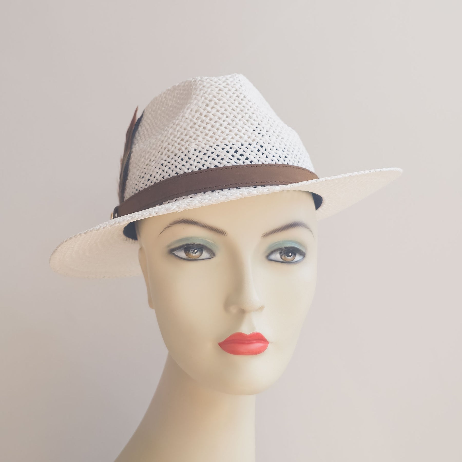 So cool and stylish, this open-weave sunhat in a stylish fedora shape and a choice of three lovely colours is as perfect for wearing on the beach as it is about town or to the Races. The leather band an feather trim gives it a classy finish.