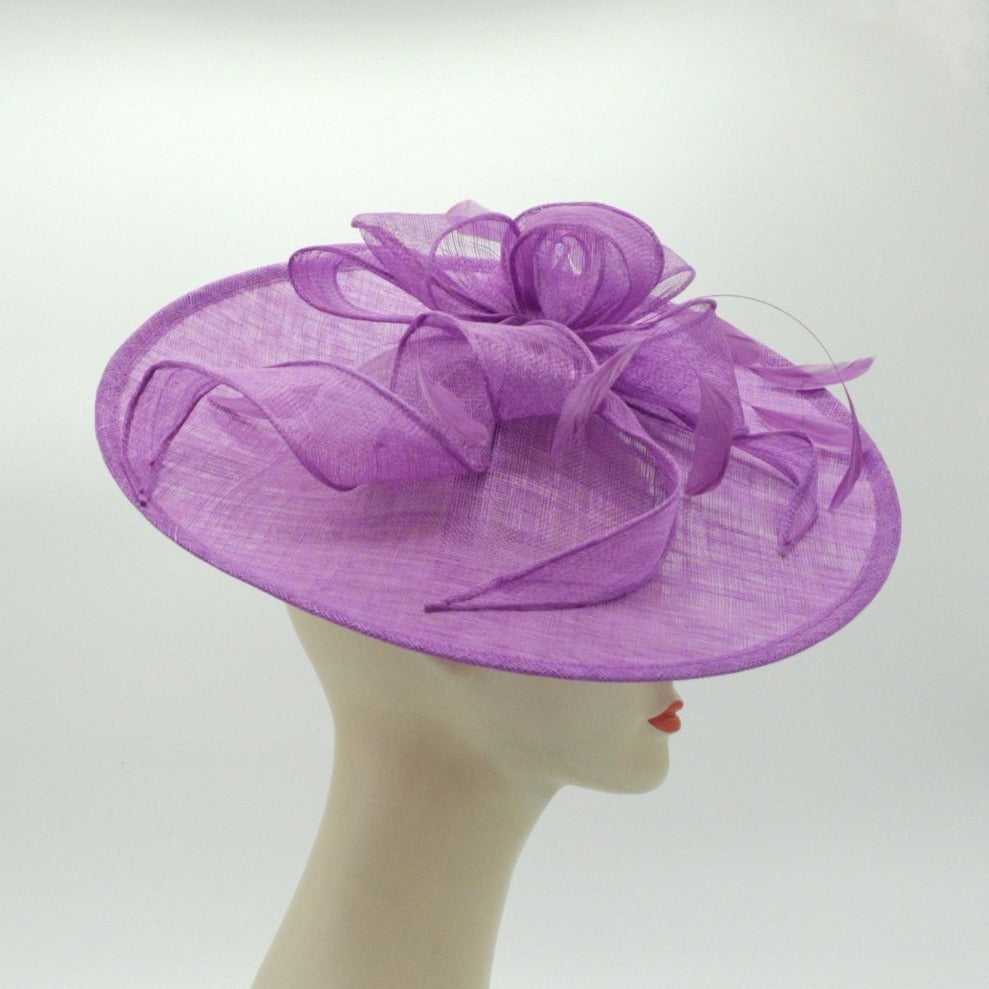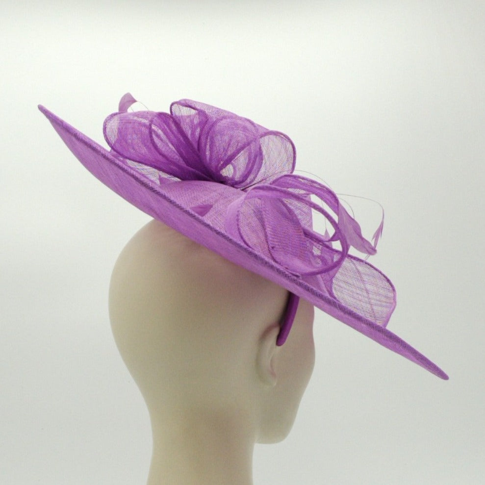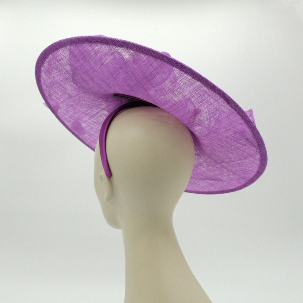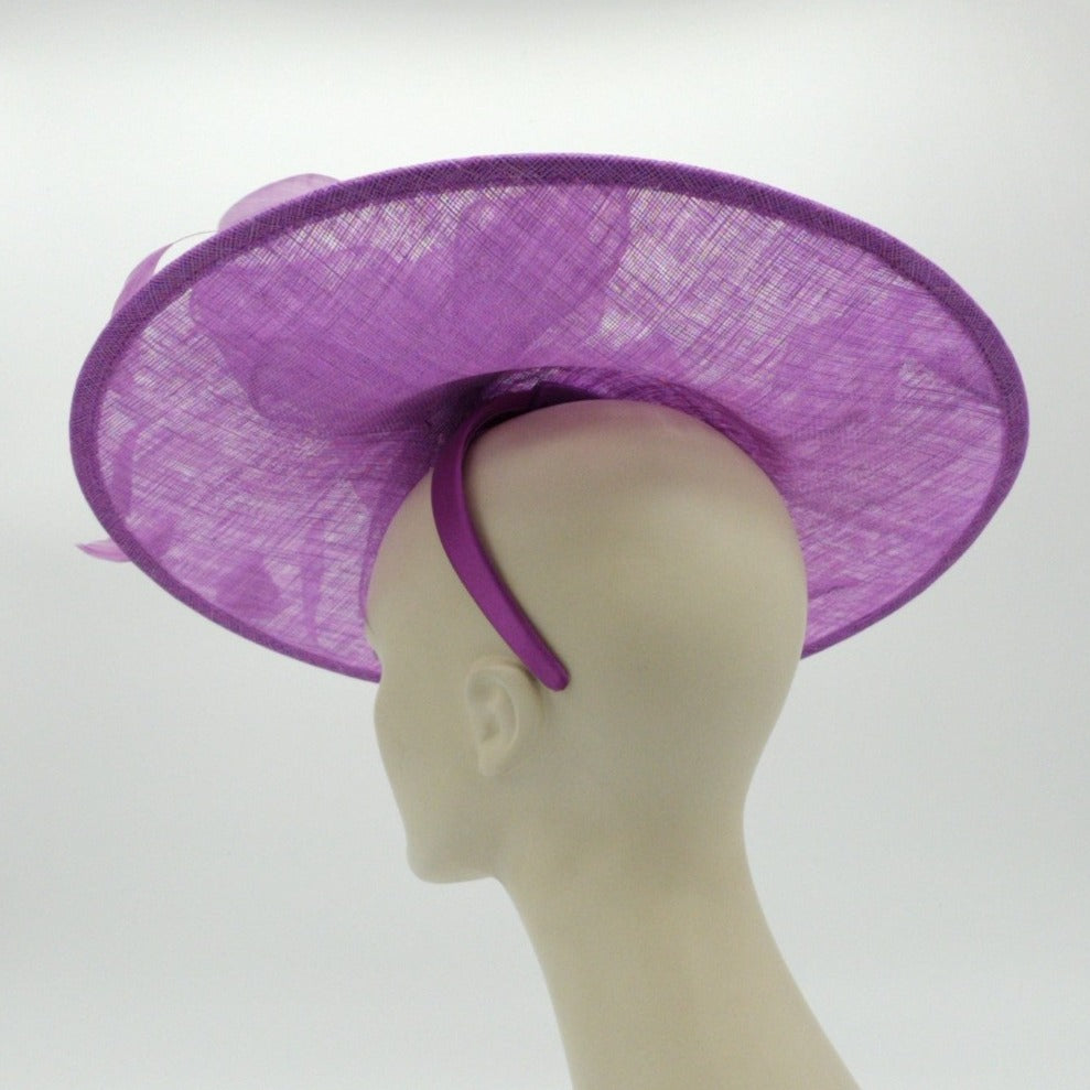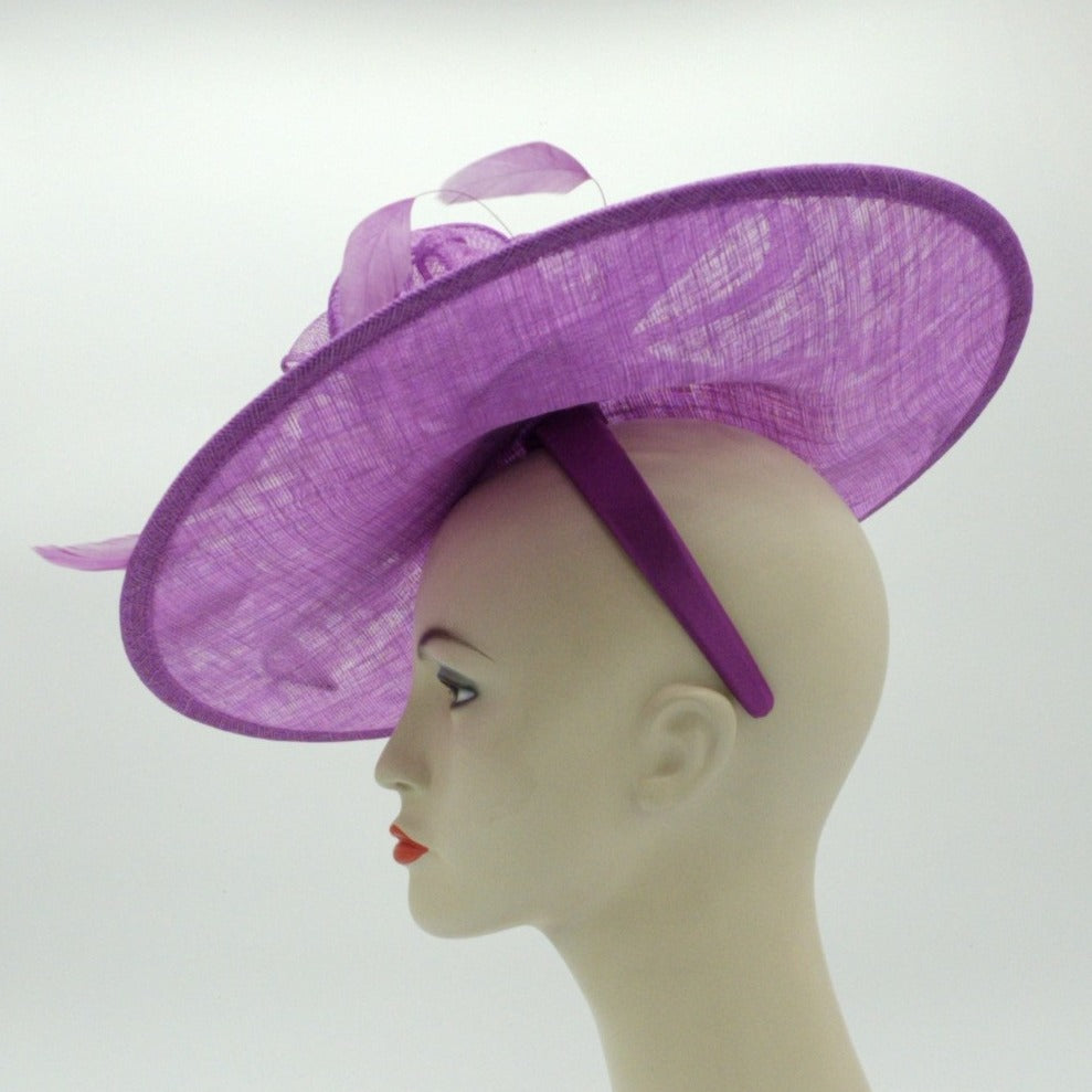 A gorgeous medium sized sinamay hatinator adorned with sinamay bow and twist trim finished with feathers. The brim is upturned to the left side and sweeps gracefully over the right side of your head, setting off your face. Held in place by a satin covered headband this hat on a band is comfortable for all-day wear. A very classy look for an occasion such as a wedding, Royal Garden Party and more.