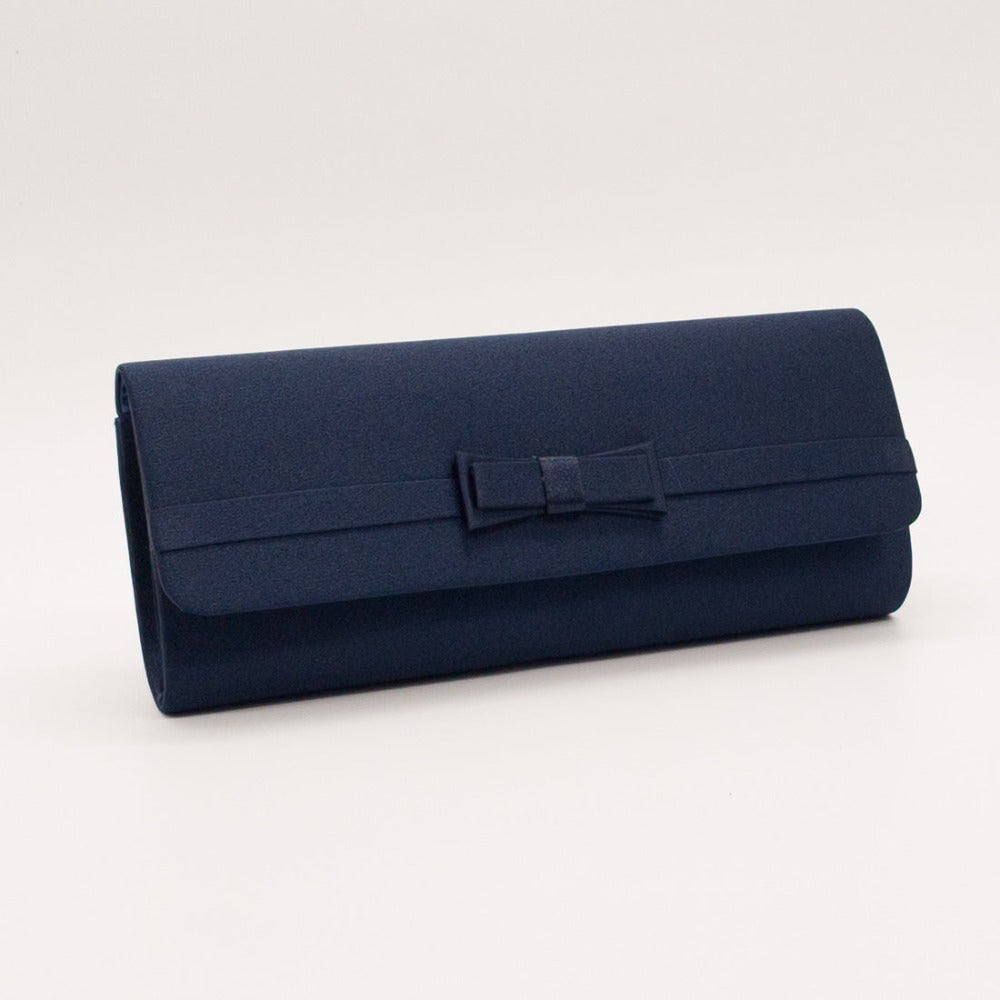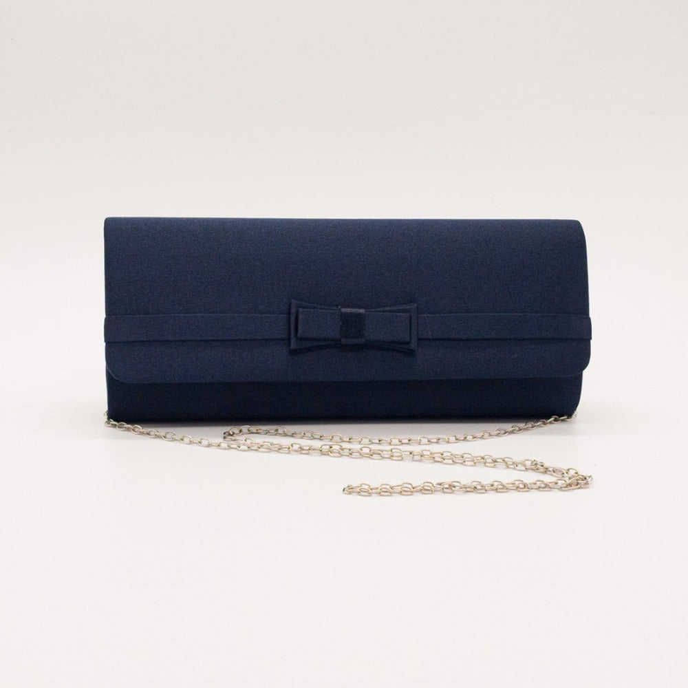 This elegant satin clutch has a lovely subtle little bow on its flap. It is fully lined, has a useful sized compartment and a small pocket on the inside and it closes with a magnetic catch. The clutch bag can be worn as a shoulder bag by using the detachable gold-effect chain strap. An ideal bag for a night out, a wedding or Garden Party or for any occasion when you want to look smart. Measurement 26cm x 10cm x 5 cm.
