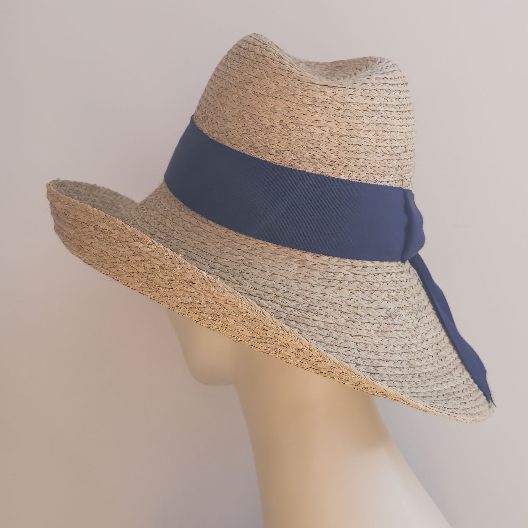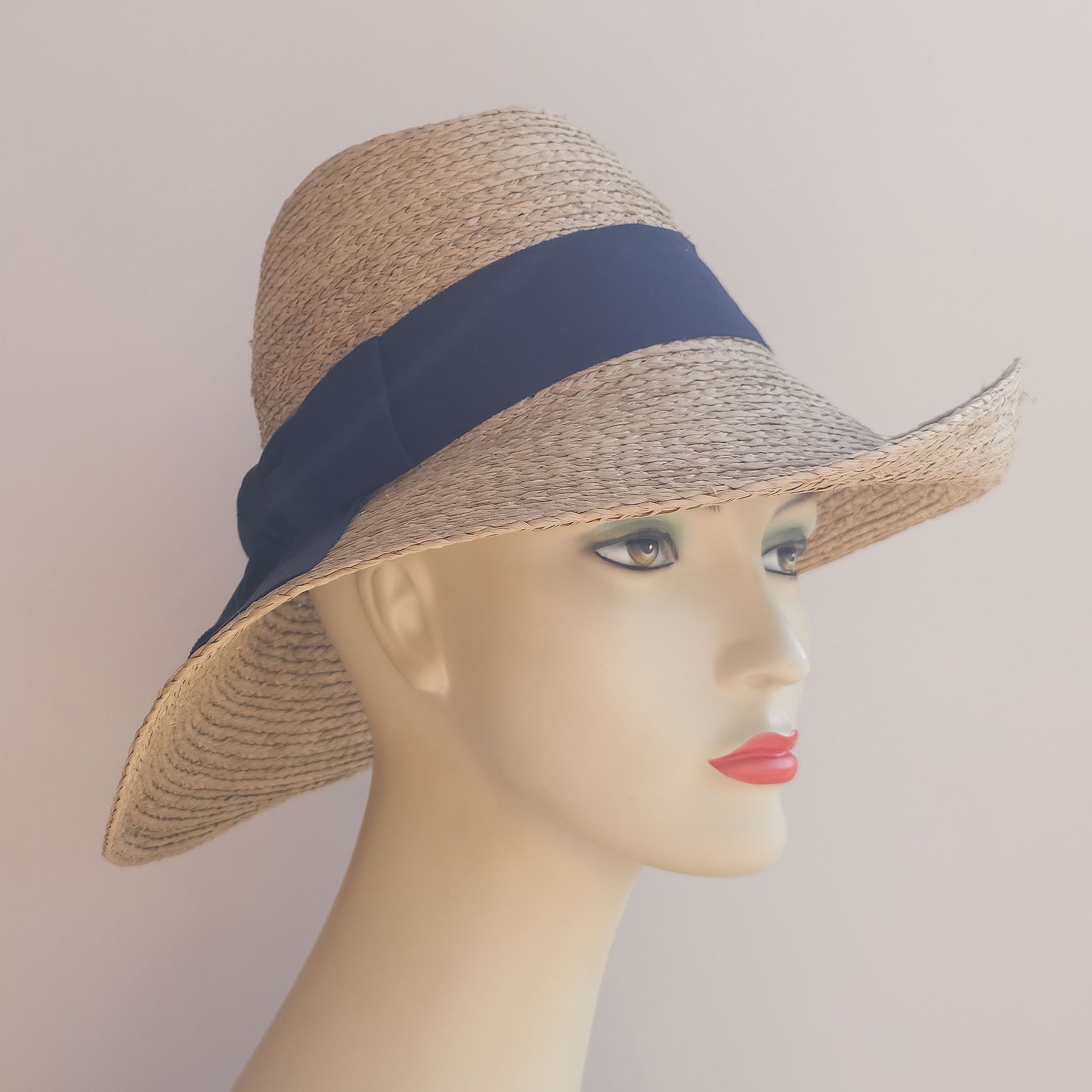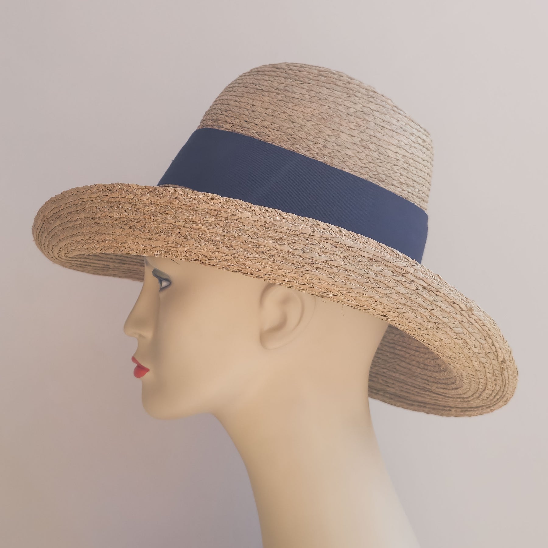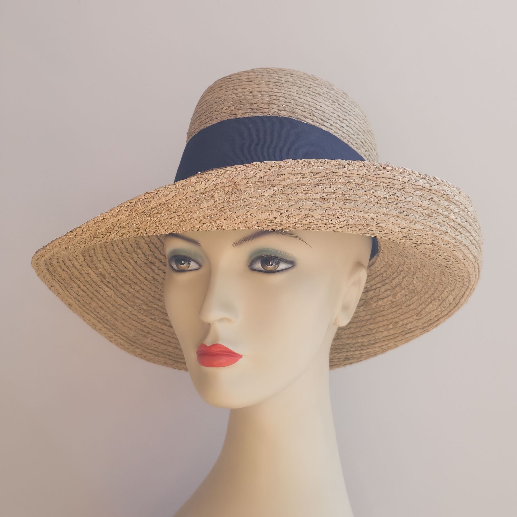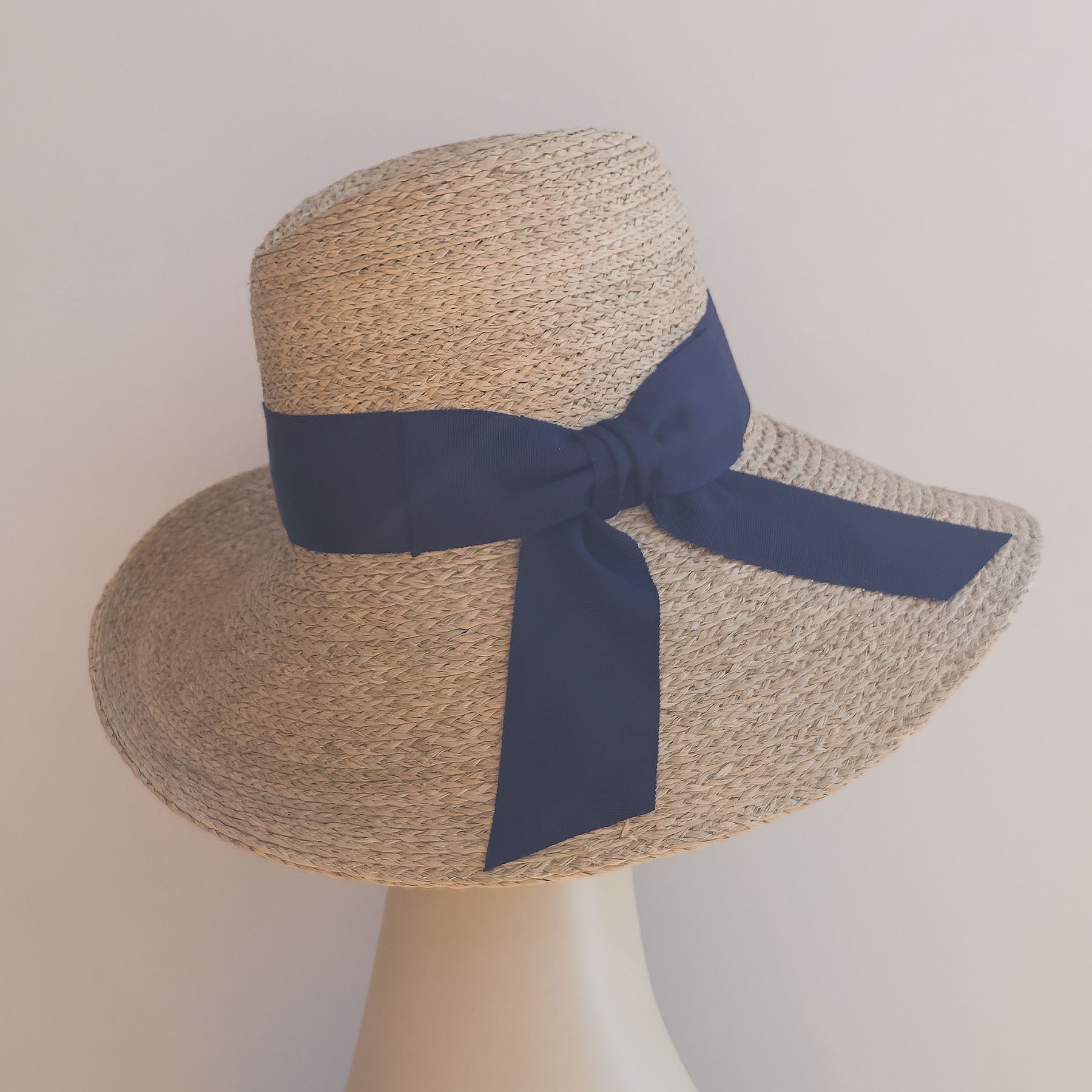 An elegant natural Straw Hat with a high crown and deep brim which sweeps up on the left and down to the right side, shielding the back of your neck from the sun. It is trimmed with a broad navy grosgrain ribbon and bow towards the back.